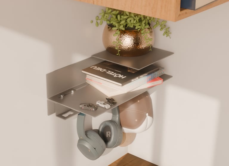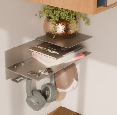 The second is a compact wall unit for your daily essentials. With a shelf and hooks for bags, keys, or headphones, it combines brutal efficiency and sleek design, perfect for entryways or workspaces.