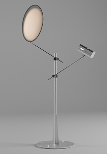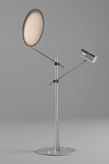 The first product is a floor lamp that redefines light through reflection. Adjustable arms direct a spotlight onto a metal or 3D-printed disc, creating a distinctive, brutalist light signature with a rugged, utilitarian form.